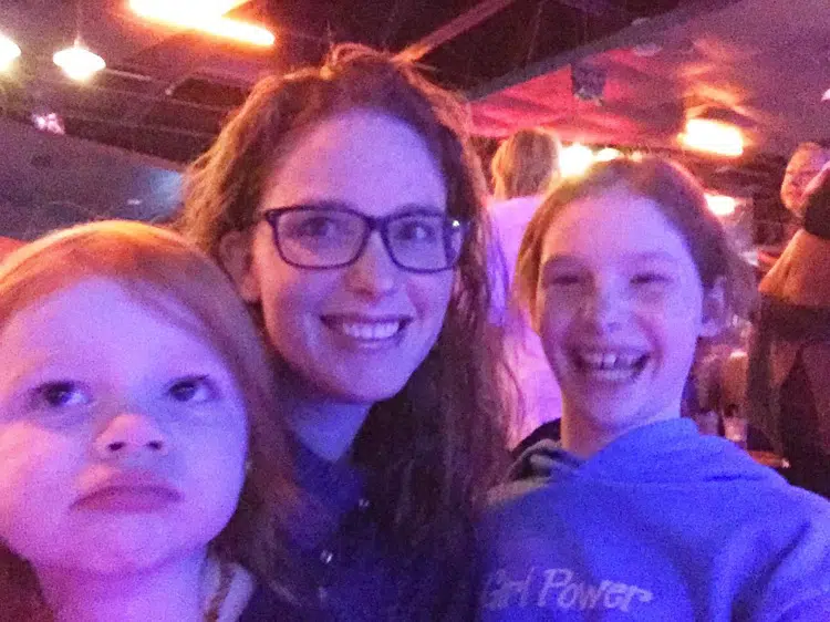 After bowling, we checked out the cutting-edge arcade with more than 55 games, seven billiard tables, two foosball tables. Ski-ball and connect four were big winners. Apparently, somebody finally found her smile and wasn’t able to look at the camera. So I call that a total win.