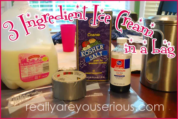 - Inside a quart sized freezer bag: 1c milk (whole or even half and half) 1T sugar 1/2 t vanilla seal with duct tape (the silver one)