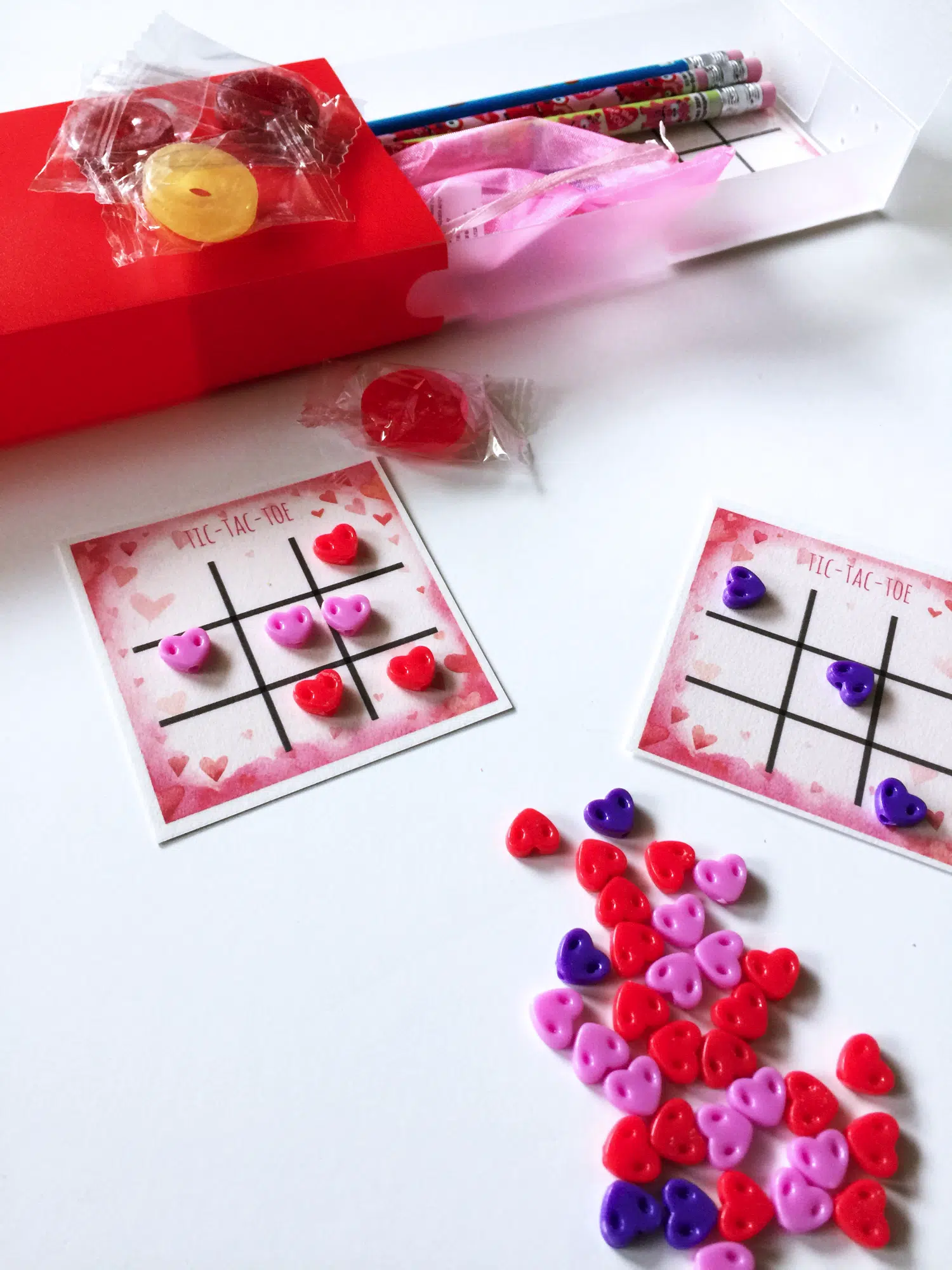 So, this year, we are using pencil boxes for our Valentine’s to have a little grab and go case that can be tossed in a bag waiting for a soccer game to start, or even a school bag for homework time. Inside the pencil boxes, are pencils (but of course), a couple tasty Valentine’s candies and a laminated printed tic-tac-toe board (which you can grab and print on your own) with little heart beads in a little organza bag for marking the spots.