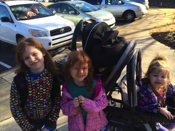 When B was less than three weeks old, it was time for me to venture out with all four girls by myself. Ack. I admit, I was very nervous. We had to take B to a follow up ENT appointment and the only time they did those appointments was in the afternoon, also known as the time that everybody is home from school.
