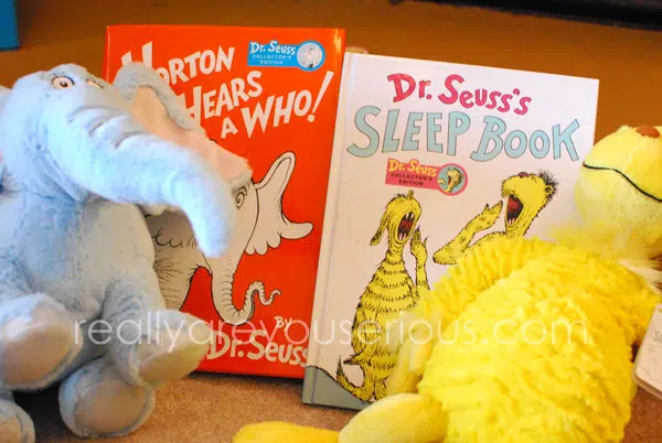 Almost all of our Dr. Seuss books and stuffed animals are from the Kohl’s Cares program. My mom and sister really enjoy shopping there, so they often pick up one of the $5 Dr. Seuss books and plush toys. This Spring 2013 Kohl’s Cares merchandise program will be featuring Dr. Seuss books (The Cat in The Hat, Horton Hears a Who!, Sleep Book, ABC’s and Happy Birthday to You!) and corresponding plush toys.  From each book and toy purchase Kohl’s donates 100 percent of the net profit to children’s health and education initiatives nationwide.