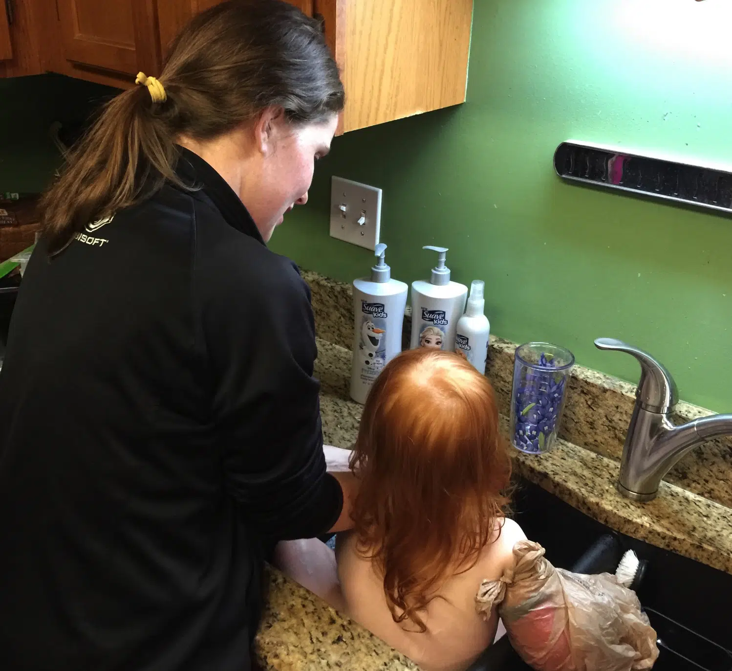 If you are bathing your child alone, you will likely want to have one hand on the casted appendage at all times. To do this, you have to have dispensers for wash and shampoo that have pumps on them. You will need to be able to get soap with one hand and wash with one hand.